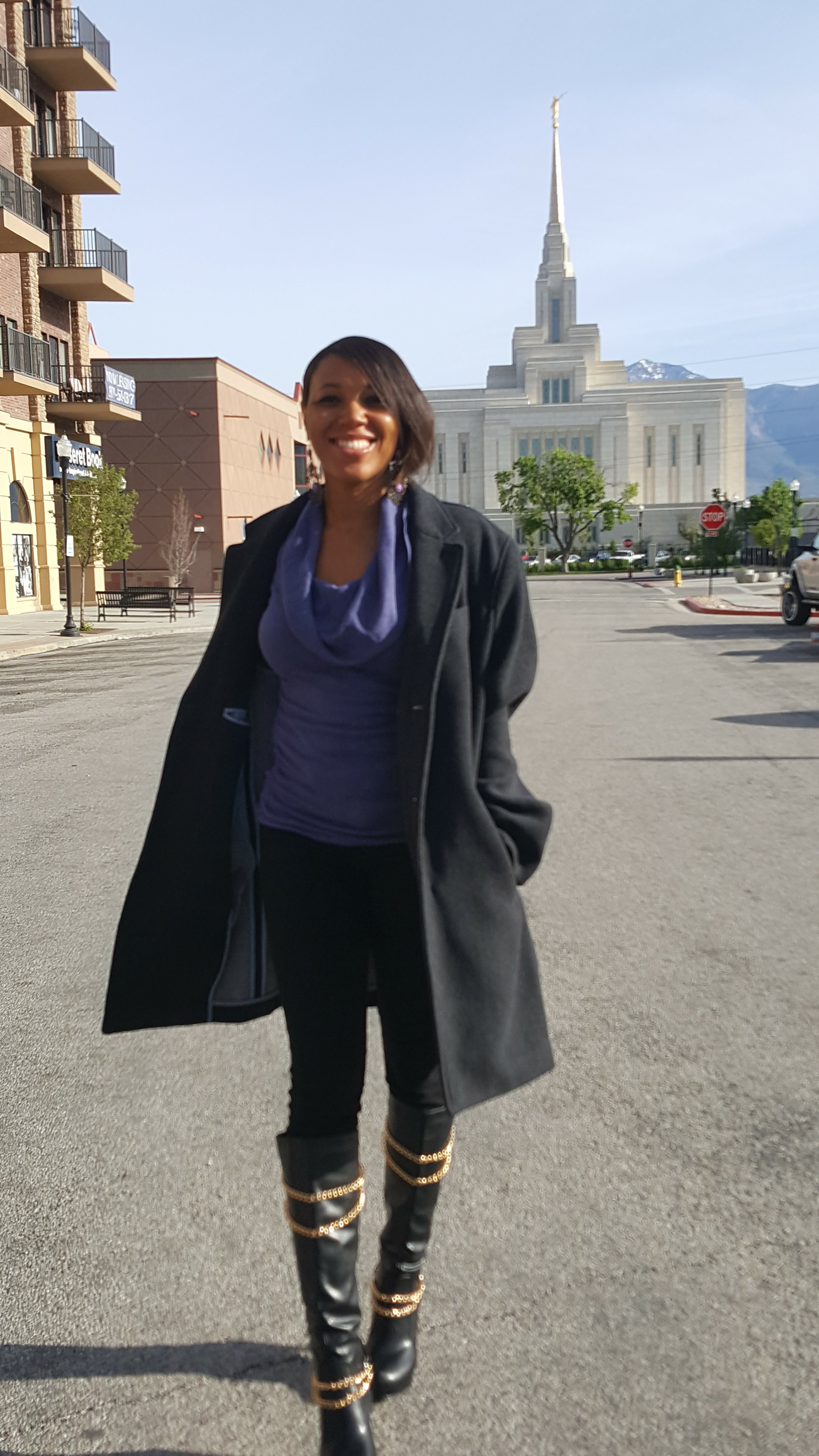 These boots, which are my favorite, were way more comfortable than the ones on the first picture. They’re regular heels and not stiletto. They are so easy to walk in and very comfortable. They match with almost every color. I love to hear the chains when I walk. I was in Ogden Utah in that picture. One of the nicest places I’ve ever visited. Look at the temple behind me!