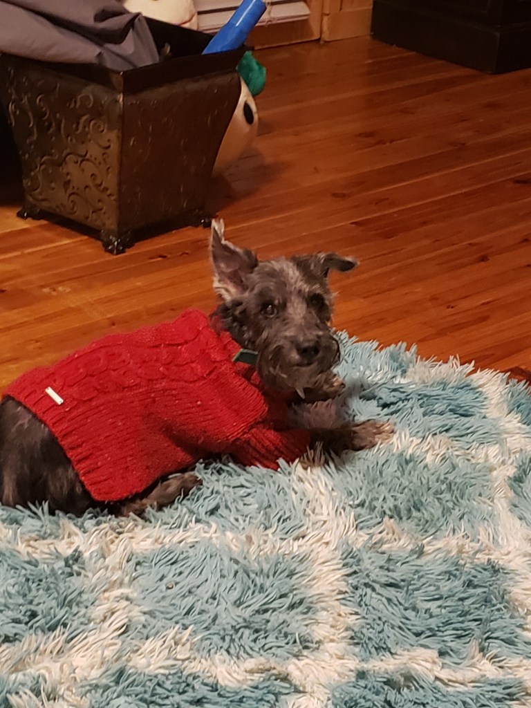 I often talk about the little blue sweater but I don’t talk about the red one. Onyx was gifted his fabulous little red sweater for Christmas in 2018. Up until then I had never put a shirt on him. I honestly thought it was silly to put a shirt on a dog. I mean they already have on fur coats full time, lol!